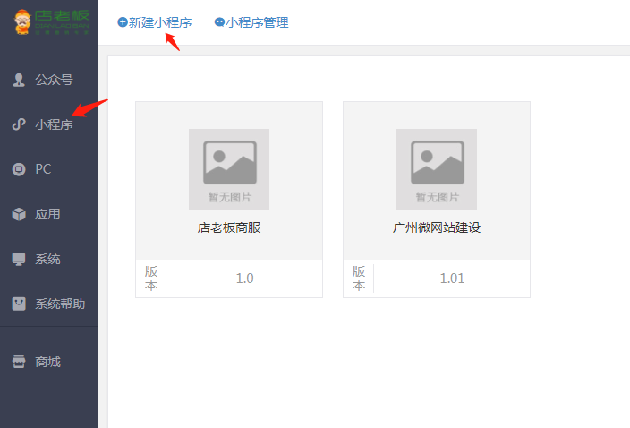 一、登錄店老板后臺 (https://www.dian68.net/web),進入小程序->新建小程序->手動添加小程序->新建小程序。
